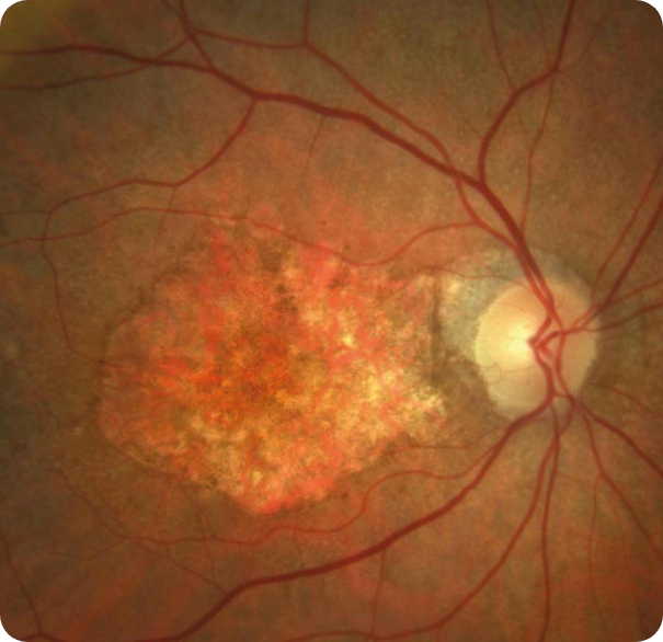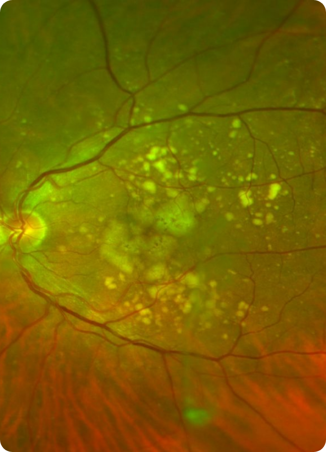 Esta neovascularización se asocia a la fuga de líquido y de sangre hacia el tejido retiniano, lo cual causa disminución importante de la visión en el centro del campo visual.